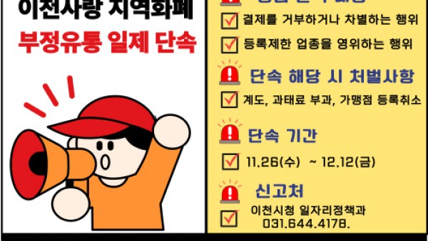 이천시(시장 김경희)는 경기이천사랑지역상품권의 올바른 사용 환경을 조성하고 건전한 유통 질서를 확립하기 위해 11월 26일부터 12월 12일까지 지역사랑상품권 부정유통 근절을 위한 일제 단속을 추진한다고 밝혔다.2. 이천시 경기이천사랑지역상품권 부정유통 일제단속 추진 이번 단…
