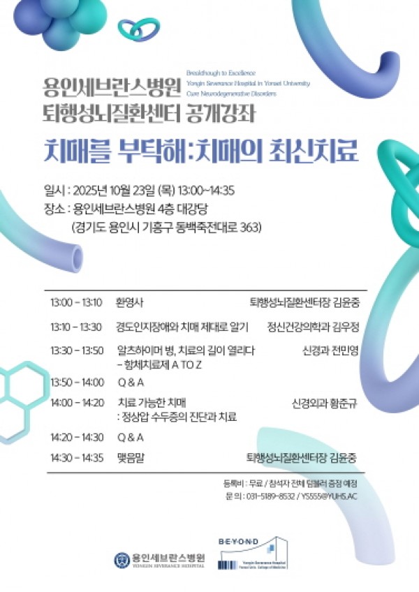 연세대학교 용인세브란스병원(병원장 김은경)은 오는 23일 병원 4층 대강당에서 지역주민과 교직원을 대상으로 ‘치매를 부탁해: 치매의 최신치료’ 공개강좌를 개최한다. 용인세브란스병원 퇴행성뇌질환센터 ‘치매를 부탁해: 치매의 최신치료’ 공개강좌 포스터강좌는 경도인지장애, 알츠하이머병, 정상압 수두증 등 치매 관련 질환 정보를 공유하고, 항체치료제 등 치매 치료의 최신 흐름을 일반인의 시각에서 쉽게 풀어낼 계획이다.&nbs…