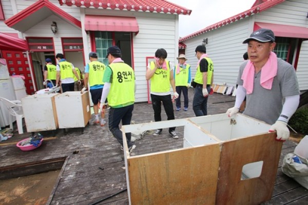 용인시는 25일 최근 기록적인 폭우로 큰 피해를 입은 청주시 상당구 미원면 옥화리 일대에서 직원 90명이 현장에 나가 복구작업을 지원했다고 밝혔다. 이날 직원들은 물에 잠겼던 펜션 내부의 벽지와 쓰레기를 제거하고 부서진 구조물과 설비를 수리하는 등 복구작업을 도왔다. &n…