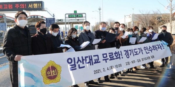 ❍ 고양․김포․파주 지역 경기도의회 의원 20명은 2월 4일 일산대교에서 경기도 서북부 200만 시민의 교통복지와 차별적인 통행료 부담 해소를 위한 근본적 해결책으로 “경기도의 일산대교 인수를 통한 통행료 무료화 방안”을 제안하고, 이를 위해 관계기관이 전향적으로 협력할 것을 촉구했다. 210204 고양ㆍ김포ㆍ파주 경기도의원, 道의 일산대교 인수 통한 통행료 무료화 촉구 (1) ❍ 1.8km 구간의 일산대교 통행료는…