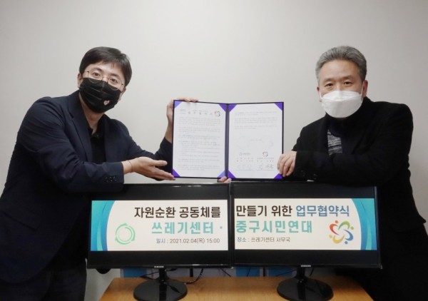 2021년 2월 4일 쓰레기센터(대표 이동학)와 사단법인 중구시민연대(대표 김재동)가 쓰레기센터에서 업무협약을 체결했다. [첨부]협약식 사진업무협약을 통해 두 기관은 ▲중구 시민의 참여 민주주의의 실현과 아름다운 지역공동체를 위한 협력, ▲지역 사회의 문제 파악과 해결방안 도출을 위한 협조, ▲지역사회 발전을 위해 공동으로 노력한다. 쓰레기센터의 이동학 대표는 “지역 사회의 분리배출과 쓰레기 …