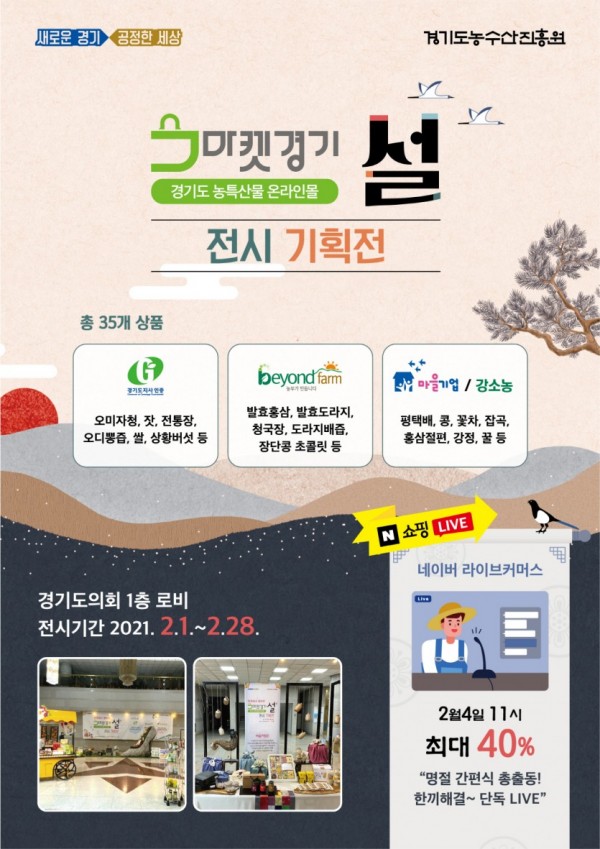 경기도농수산진흥원이 설 명절을 맞아 오프라인에서는 농협 하나로마트 수원·성남·고양점 경기농식품 전용관과 경기도의회에서, 온라인에서는 경기도 농수산물 온라인몰 ‘마켓경기’와 네이버 ‘쇼핑 라이브’에서 특별 판매전을 연다.경기도+우수농산물+설특별전+온라인+배너먼저 2월 28일까지 경기도의회 1층에서 가평, 김포, 안산, 양평, 파주 등 16개 지역의 34개 업체가 참여하는 ‘마켓경기 설 특별 전시 기획전’이 진행된다. 경기도+…