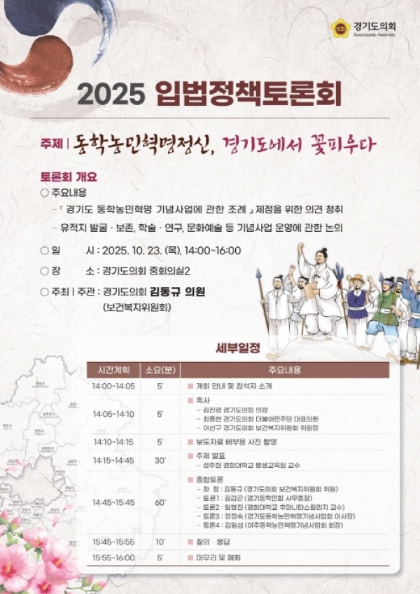 경기도의회 김동규 의원(더불어민주당, 안산1)은 오는 10월 23일(목) 오후 2시, 경기도의회 중회의실2에서 입법정책토론회를 개최한다고 밝혔다.251022 김동규 의원, 경기도 동학농민혁명 기념사업 조례 제정을 위한 입법정책토론회 개최 이번 토론회는 김동규 의원 주관으로, 경기도에 ‘동학농민혁명 기념사업 조례’ 제정을 추진하기 위한 취지에서 마련되었다. 토론회에서는 성주현 경희대학교 평생교육원 교…