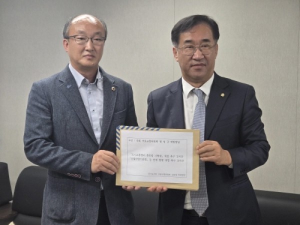 경기도의회 건설교통위원회 김동영 부위원장(더불어민주당, 남양주 오남)은 20일(월) 경기도청 율곡홀에서 열린 2025년 국회 국토교통위원회 국정감사 현장을 찾아, 국회 국토교통위원회 맹성규 위원장에게 「도시교통정비 촉진법 시행령」 개정 촉구 건의안과 「건설산업기본법」 개정 촉구 건의안 등 경기도의회가 의결한 두 건의 건의안을 전달하였다.251021 김동영 의원, 국회 국토교통위원회 맹성규 위원장 만나 ‘건설교통 현안 …