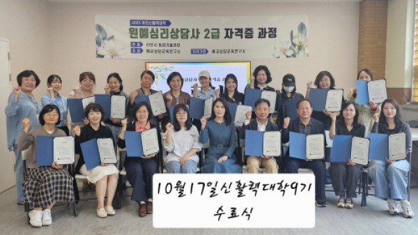 이천시 농업기술센터(소장 이태영)가 주최하고 예교상담교육연구소(대표 손진)가 주관한 ‘이천신활력대학 제9기 원예심리상담사 2급 자격증 과정’이 지난 10월 17일, 이천신활력대학 교육장에서 수료식을 열고 8주간의 교육 일정을 성공적으로 마무리했다.8. 이천 신활력대학 제9기 원예심리상담사 2급 자격증 과정 수료식 성료1 이번 제9기 과정은 8월 22일부터 10월 17일까지 총 8회, 32시간 동안 진행됐다.…