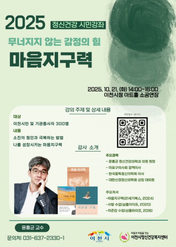 이천시정신건강복지센터는 오는 10월 21일(화) 오후 2시부터 4시까지 이천아트홀 소공연장에서 2025년 정신건강 시민강좌 ‘무너지지 않는 감정의 힘, 마음 지구력’을 개최한다. 이번 강좌는 취업, 학업, 결혼 등 다양한 스트레스 환경 속에서 살아가는 이천 시민들에게 마음 건강의 중요성을 알리고 정신건강 회복의 계기를 마련하기 위해 기획됐다.3. 이천시 정신건강의 날 기념 정신건강 시민강좌 개최1 이번 강연에는 베스…