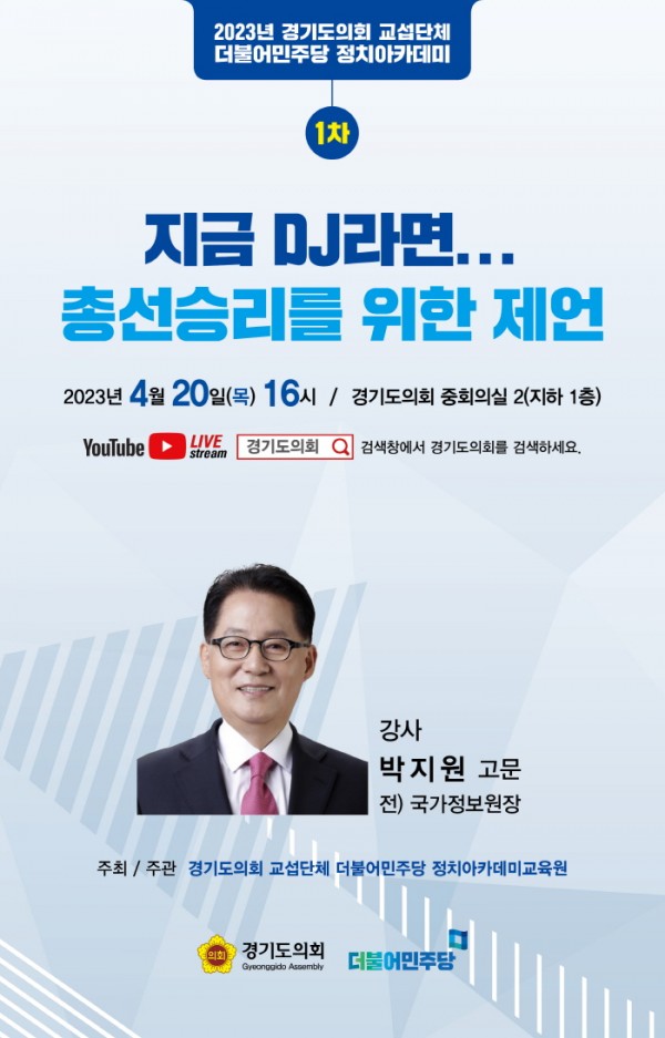 정치 9단 박지원 전 국정원장이 경기도의회를 찾는다경기도의회 더불어민주당 정치아카데미교육원(원장 이은주 의원)은 오는 20일(목) 박지원 전 국정원장이 “2023년 정치아카데미” 첫 번째 강사로 나서 “지금 DJ라면...총선승리를 위한 제언”이란 주제로 강의를 연다고 밝혔다. 정치아카데미 웹자보박지원 전 원장은 강의를 통해 윤석열 정부 출범 이후 달라진 민생, 경제, 민주주의, 외교, 남북관계에 대한 진단과 …