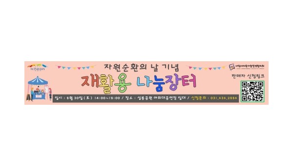 이천시(시장 김경희)는 오는 8월 30일(토)에 설봉공원 내 대공연장 일원에서 자원순환의 날(9월 6일) 기념 나눔장터를 개최할 계획이다.3. 이천시 자원순환의 날 기념 같이해요! 가치마켓 나눔장터 개최1 나눔장터는 자원 재활용을 통해 낭비를 막고 환경보호와 나눔의 가치를 실현하는 벼룩시장으로, 가족이나 비영리 단체(영리상인 참여 불가) 등 다양한 참가자가 재사용 가능 물품을 판매하거나 교환하는 행사이다. 이번 장터…