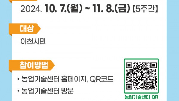 이천시(시장 김경희)는 2025년도 농업인 교육과정 선정에 앞서 이천 시민과 농업인들의 의견을 수렴하기 위해 10월 7일(월)부터 11월 8일(금)까지 5주간 농업인 교육 수요조사를 진행한다고 밝혔다. 4. 이천시 농업인 맞춤형 교육과정 개설을 위한 수요조사 실시 이…
