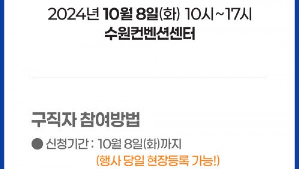 경기도일자리재단(이하 재단)은 경기도와 KB국민은행과 함께 ‘2024 경기도KB굿잡(JOB) 페스티벌’을 오는 10월 8일 수원컨벤션센터에서 개최한다.이번 행사에는 약 200개소의 우수 중소기업이 참여해 2,000명이 넘는 인력을 채용할 예정이다. 굿잡+페스티벌 ‘20…