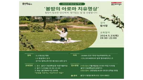 용인특례시(시장 이상일)는 오는 23일 열리는 ‘2024년 2회 퇴근길학당’ 강사로 함서정 아로마테라피스트를 초청했다고 2일 밝혔다.용인특례시가 함서정 아로마테라피스트를 초빙해 마음건강 회복 특강을 진행한다. 함서정 강사는 아로마 명상 강사로 다양한 기관에서 마음 치…