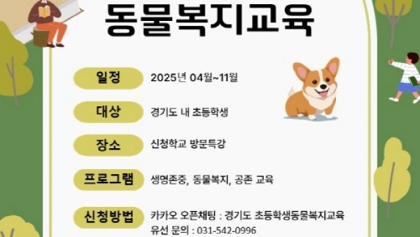 경기도가 도내 초등학교 1학년 학생들을 대상으로 오는 11월까지 찾아가는 동물복지교육을 실시한다.이번 교육은 경기도 주민참여 민관협치형 사업으로 선정되어, 자아형성단계인 초등학생에게 생명존중과 동물복지에 대한 올바른 인식을 심어주기 위해 마련됐다. 교육은 신청 학교를 방문해 특강 형식으…