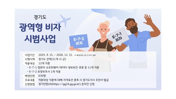 경기도가 IT, 돌봄 등 외국인 전문인력 유치를 위한 경기도 맞춤형 비자 제도를 도입한다. 도는 15일부터 ‘경기도 광역형 비자 시범사업’을 시행해 기업의 인력난 해소와 외국인의 안정적인 지역 정착을 지원한다고 밝혔다.인포그래픽(1)경기도 광역형 비자 시범사업은 경기도지사 명의의 추천서…