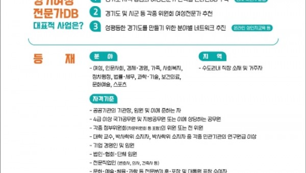 경기도여성가족재단이 도내 여성전문가들의 정책과정 참여와 교류협력을 위한 ‘경기 여성전문가DB’ 신규 등재자를 모집한다.여성전문가DB는 경기도내 분야별 여성전문가 인력풀을 구축하고 도 및 시군 각종 위원회에 추천하기 위한 사업이다. 2025년 현재 경제․경영, 법률, 과학기술 등 총 11…