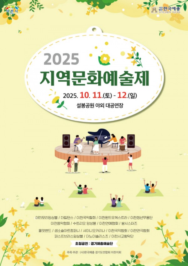 (사)한국예총 이천지회가 주최·주관하는 지역 예술인들의 축제인 ‘2025년 지역문화예술제’가 오는 10월 11일(토)부터 12일(일)까지 이틀간 오후 2시부터 오후 6시 30분까지 설봉공원 야외대공연장에서 개최된다.2. 이천시 황금 추석연휴 설봉공원서 2025년 지역문화예술제 개최1 1일차(토)에는 아리모리앙상블, 더탑댄스, 이천국악협회, 이천윈드오케스트라, 이천청년무용단, 이천음악협회, 수트리오앙상블,…