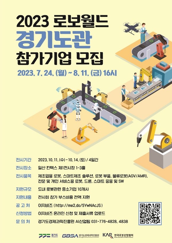 경기도와 경기도경제과학진흥원은 로봇 기업 경쟁력 강화와 판로개척을 위해 국내 최대 규모 로봇 전시회인 ‘2023 로보월드’의 경기도관 참가기업을 8월 11일까지 모집한다.이번 사업은 경기도 로봇산업 육성지원 사업의 하나로, 도내 로봇 관련 중소기업에 참가 부스 비용 전액을 지원한다. (포스터)+2023+로보월드+경기도관+참가기업+모집_최종 ‘2023 로보월드’는 산업통상자원부가 주최하고 한국로봇산업협회, 한국…