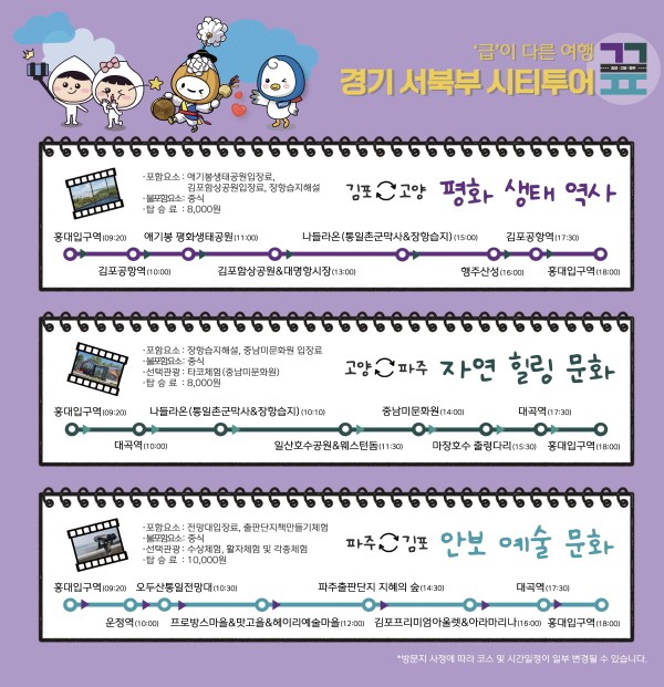 경기도와 경기관광공사가 7월 28일부터 12월 3일까지 김포, 고양, 파주시의 주요 관광지를 연결하는 관광 프로그램 ‘경기 서북부 시티투어’를 운영한다. 경기+서북부+광역시티투어+코스+안내v2 시티투어는 매주 금·토·일요일 운행하는 정규노선과 지자체별 행사 및 관광 수요 등을 반영한 기획노선으로 구성됐다.정규노선은 2개 시 대표 관광지를 연결하는 당일 코스다. 금요일 김포-고양 코스(애기봉 평화생태공원, 장…