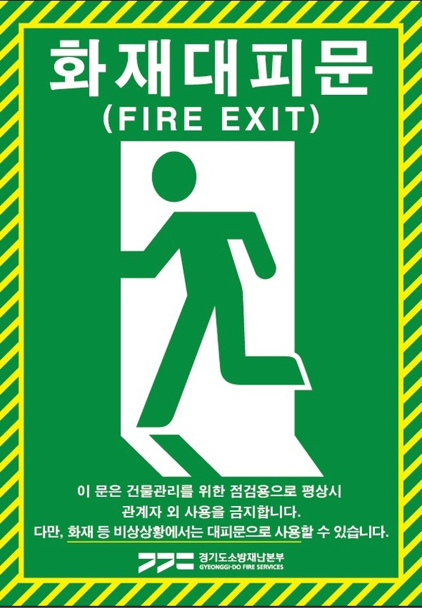 경기도소방재난본부는 옥상출입문 안내표지 등 아파트 옥상 피난시설 3종 1만2천여 점을 제작해 도내 아파트에 무료 보급한다고 13일 밝혔다.옥상 피난시설 3종은 ▲옥상출입문 안내표지 ▲피난안내 테이프 ▲피난 경로 이탈 방지 펜스 등이다. 옥상출입문+안내표지 ‘화재대피문’이라고 기재된 옥상 출입문 안내표지는 비상구(문)에 부착하면 되고, 피난 안내 테이프는 화재 대피 문으로 가는 길을 따라 벽에 붙이면 된다. …