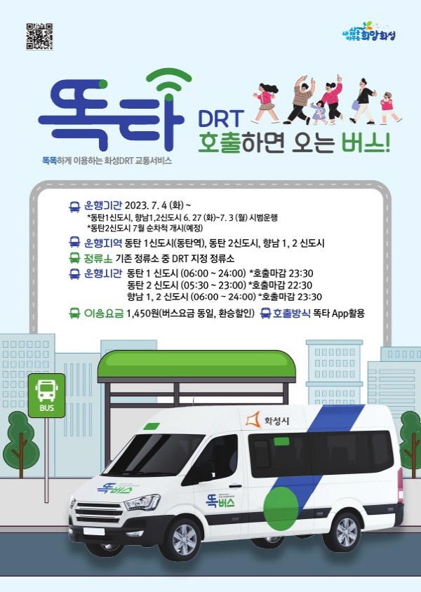 원하는 시간에, 원하는 장소에서 탑승해 원하는 목적지로 이동할 수 있는 신개념 교통수단 ‘똑버스’가 화성 동탄·향남 일원에서 단계적으로 운행을 개시한다. 화성+홍보+포스터 경기도와 경기교통공사는 지난 27일부터 동탄1신도시·향남 똑버스에 대한 시범 운행 후 7월 4일부터 정식 운행을 시작했다. 차량은 13인승 현대 쏠라티 차량으로 5대씩, 총 10대를 매일 오전 6시부터 자정까지 운행한다.동탄2신도시는 7월…