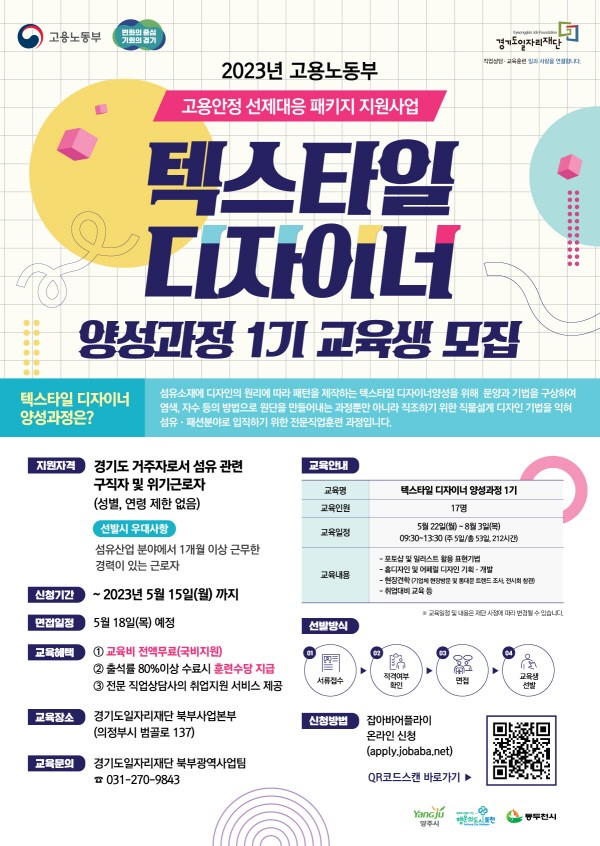 경기도와 경기도일자리재단이 경기북부 섬유산업 활성화와 일자리 창출을 위해 고부가가치 상품 개발인력을 양성하는 ‘텍스타일 디자이너 양성 과정’ 1기 교육생을 모집한다. 배포용사진 이 사업은 고용노동부가 공모하고 지자체가 예산을 지원받는 ‘고용안정 선제 대응 패키지 지원사업’의 하나로 경기도일자리재단은 교육 과정 수행기관으로 참여한다.‘텍스타일 디자이너’는 섬유 소재에 패턴과 문양, 기법, 염색, 자수 등을 통…