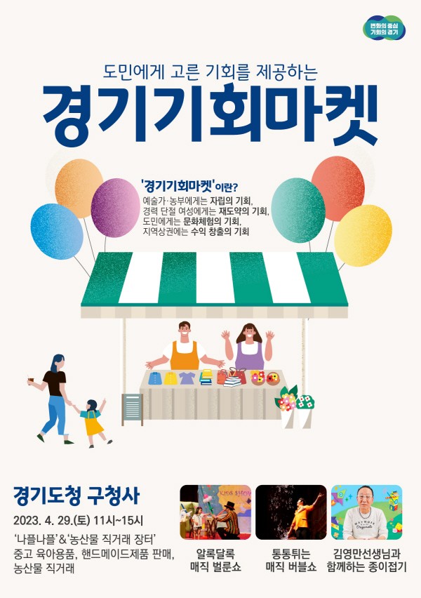 경기도는 오는 29일 수원시 팔달구 경기도청 옛청사에서 수원맘카페, 경기농협과 함께 두 번째 경기기회마켓을 개최한다. (4.29.)+경기기회마켓+포스터 이번 행사는 경기도가 도청사 이전으로 위축된 구청사 주변 상권을 활성화하기 위해 민간 유명 벼룩시장(플리마켓)과 손잡고 여는 두 번째 행사로 수원지역 최대 온라인 커뮤니티인 ‘수원맘 모여라’와 농협 경기지역본부와 함께한다.29일 오전 11시부터 오후 3시까지…