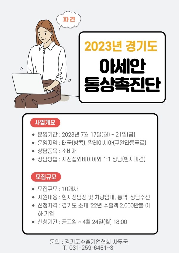 경기도는 (사)경기도수출기업협회와 아세안 신흥시장을 공략할 도내 소비재산업 수출 중소기업을 오는 24일까지 모집한다. 투자통상촉진단 ‘2023년 경기도 아세안 통상촉진단’은 7월 17일부터 21일까지 5일 동안 태국 방콕과 말레이시아 쿠알라룸푸르를 방문해 1:1 수출상담회를 통해 신규 구매자(바이어) 발굴에 나선다.이번 통상촉진단은 도내 소비재산업 수출 중소기업 10개 기업으로 구성되며, 참가기업은…