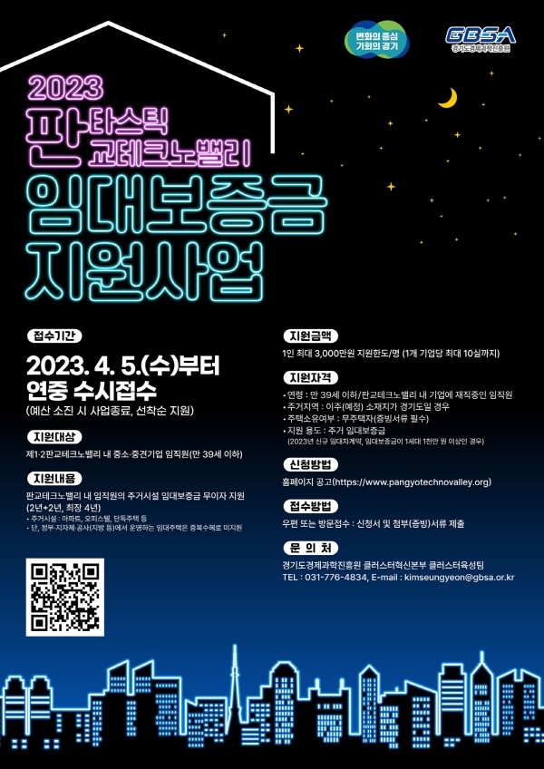 경기도와 경기도경제과학진흥원은 판교테크노밸리에서 근무하는 20~30대 근로자의 주거 안정과 통근 시간 절감을 위해 최대 3천만 원을 지원하는 ‘2023년 판교테크노밸리 임대보증금 지원사업’을 추진한다. 임대보증금지원사업_포스터_최종(1) 이 사업은 제1·2판교테크노밸리 입주기업에 근무하는 장거리 출·퇴근 직원의 주거와 근무환경을 개선해 젊은 근로자들이 좋은 환경에서 안정적으로 근무할 수 있도록 주거 임대보증…