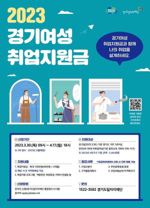 경기도가 경력 보유 여성의 재취업을 지원하는 ‘경기여성 취업지원금’을 연 최대 90만 원에서 120만 원으로 상향했다.경기도는 30일부터 ‘2023년도 경기여성 취업지원금’ 1차 참여자 1천700여 명을 모집한다.‘경기여성취업지원금’은 경력단절 이후 재취업을 위한 구직활동에 어려움이 있는 경기도 여성을 대상으로 각종 취업 지원 서비스와 함께 구직활동비용을 지원하는 사업이다. 2023년+경기여성취업지원금+포스터&nb…