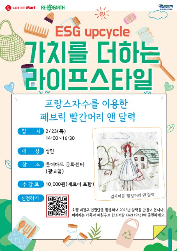 경기환경에너지진흥원은 업사이클에 대한 도민들의 공감대 형성과 경기도 업사이클 입주기업의 판로개척을 위해 롯데마트와 ESG 협력 사업을 시범 운영한다.첨부자료1첫 시범운영 사업으로 2월 23일, 3월 4일 이틀간 롯데마트 광교점 문화센터에서 업사이클 특강 및 다양한 체험을 진행한다. 호텔 폐침구 원단을 활용하여 2023년 달력을 만드는 자수 특강부터 자투리 가죽, 커피 찌꺼기를 활용한 그립톡 및 키링 만들기까지 다양한 업사이클…