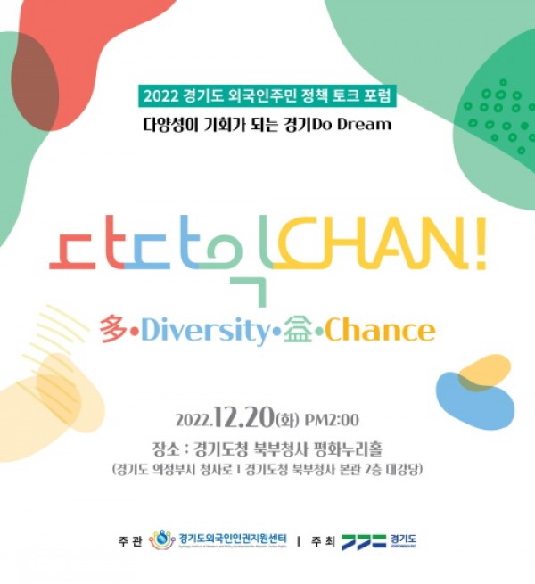 유엔이 정한 세계이주민의 날(12월18일)을 맞아 경기도에서 외국인주민 정책 토크 포럼이 열린다.(포스터)외국인주민+정책+토크+포럼경기도 외국인 인권지원센터는 ‘다양성이 기회가 되는 경기도’를 주제로 ‘2022 경기도 외국인주민 정책 토크 포럼–다다익찬(多․Diversity․益․Chance)’을 오는 20일 오후 2시 경기도청 북부청사 평화누리홀에서 개최한다고 13일 밝혔다.이날 행사에서는 주한 스리랑카 대사관 관계자 등이 …