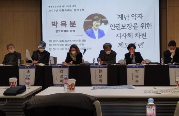 “재난 약자들의 안전과 건강, 생명과 인권을 보장하기 위한 제도 마련과 정책 추진은 시혜가 아니라 인간으로서 당연히 누려야 할 권리입니다”박옥분 경기도의원(보건복지위원회, 더불어민주당, 수원2)은 7일 수원컨벤션센터에서 열린 ‘세계인권선언 제74주년 기념 2022년 수원특례시 인권포럼’ 토론자로 참석해, 재난 약자 인권보장을 위한 지자제 차원의 제도 마련이 시급함을 주장했다.221208 박옥분 의원, 재난약자 인권보장 정책 적…