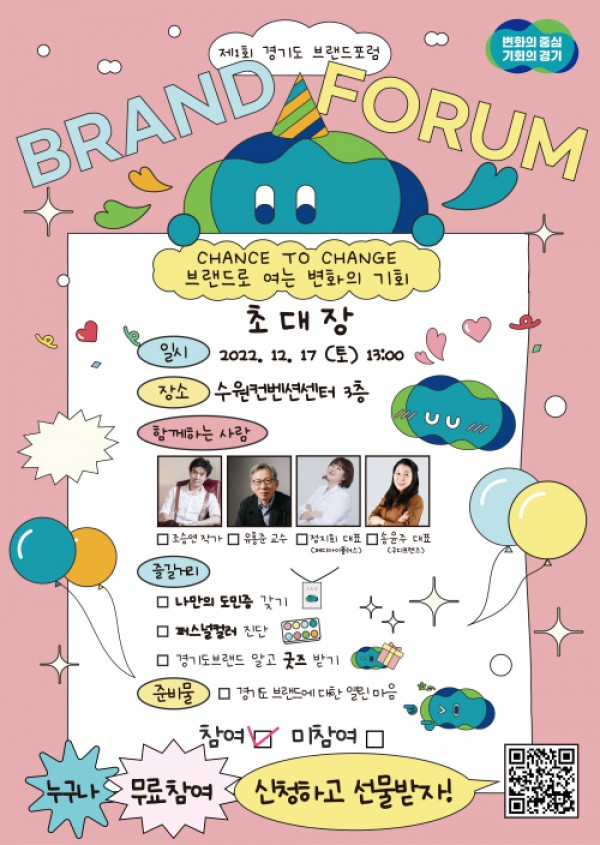 경기도민과 함께 경기도 브랜드의 어제와 오늘, 내일을 이야기하는 제1회 경기도 브랜드 포럼이 오는 12월 17일 오후 1시 수원컨벤션센터 3층 컨벤션홀에서 개최된다.경기도+브랜드포럼+홍보+포스터+최종이번 포럼은 ‘브랜드로 여는 변화의 기회’라는 주제로 진행된다. 민선 8기 도정브랜드인 ‘변화의 중심, 기회의 경기’를 바탕으로 1부 ‘변화’ 세션과 2부 ‘기회’ 세션으로 펼쳐진다.카카오톡+배부+이모티콘1부 변화 세션에서는 이종…