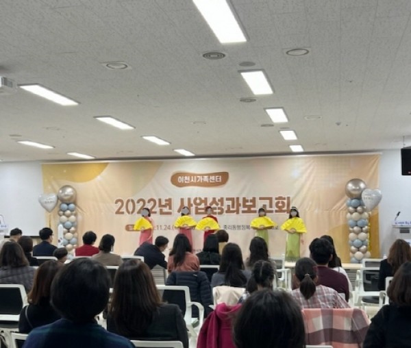 이천시가족센터는 24일 「2022년 이천시가족센터 사업성과보고회」를 김경희 이천시장을 비롯한 관내 가족들과 유관기관 실무자 등 200명이 참석한 가운데 중리동행정복지센터에서 사업성과보고회 행사를 개최했다. 이천시가족센터 사업성과보고회 (1)가족복지 전문기관인 이천시가족센터는 COVID-19 팬더믹 이후 사회적 거리두기가 지속되는 어려운 상황 속에서 다문화가족 온라인 교육 및 집콕놀이 등 가족과 함께하는 프로그…