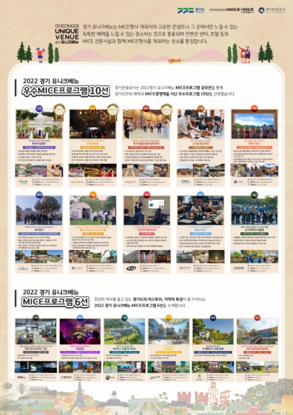 경기도와 경기관광공사는 경기 유니크베뉴(지역이색 회의명소) 마이스(MICE: 회의‧포상관광‧컨벤션‧전시박람회) 체험 프로그램 개발 공모전을 통해 16개 우수 프로그램을 선정했다고 24일 밝혔다.2022_경기+유니크베뉴+MICE+프로그램이번 공모전은 지난해 선정된 경기도 지역이색 회의명소만의 독창성을 가미한 마이스 체험 프로그램을 개발, 명소별 매력과 마이스 경쟁력 강화를 도모하기 위해 추진됐다. 전문가 및 일반인으로 구성된 …