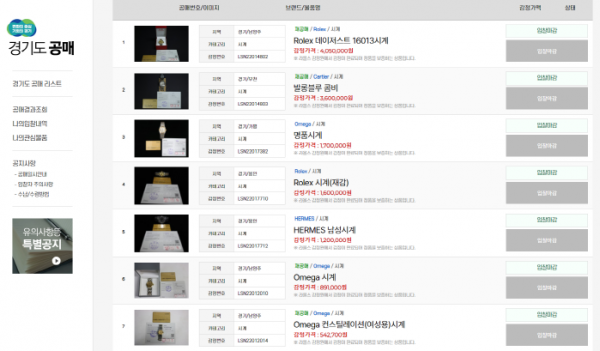 경기도가 지난 24일부터 27일까지 지방세 고액 체납자 압류 물품을 대상으로 온라인 전자 공매를 진행한 결과, 총 1천235건 중 1천228건이 낙찰돼 대금 등 12억 4천만여 원을 체납액으로 징수한다.(참고이미지)공매사이트경기도는 28일 오전 경기도 동산공매 사이트(ggtax.laors.co.kr)에서 이번 공매 낙찰자를 발표했다.앞서 도는 지방세 고액 체납자로부터 압류한 명품 가방, 귀금속, 자동차 등 1천235점을 체납…