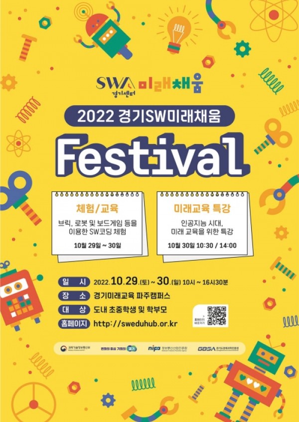 경기도가 오는 29~30일 2일간 경기미래교육 파주캠퍼스에서 ‘2022년 경기소프트웨어(소프트웨어(SW))미래채움 페스티벌’을 개최한다.SW미래채움+페스티벌+포스터경기도는 과학기술정보통신부와 함께 경기소프트웨어(SW)미래채움사업을 통해 도내 정보 취약계층 초중고 학생들에게 다양한 소프트웨어교육 프로그램을 지원하고 있다. 2020년부터 올 9월 말까지 도내 학생 6만 7,447명에게 관련 교육을 실시했다. 이번 미래채움 페스티…