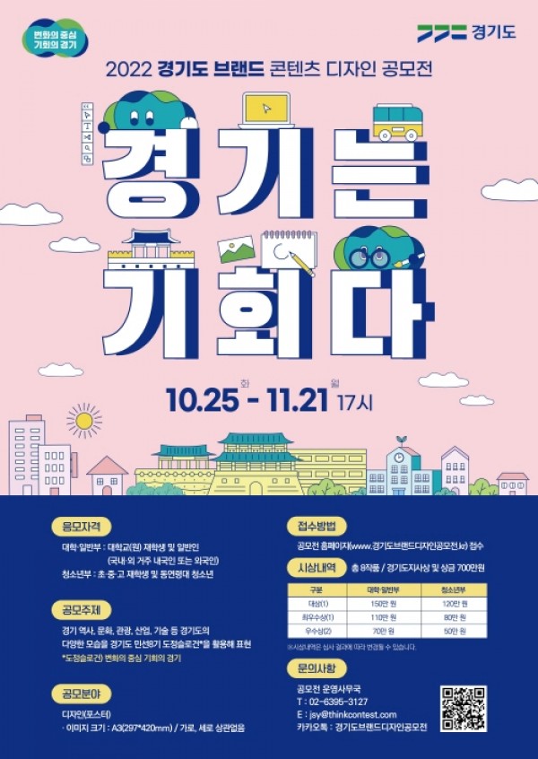 경기도가 10월 25일부터 11월 21일 오후 5시까지 민선 8기 도정 슬로건(표어) ‘변화의 중심, 기회의 경기’를 널리 알리기 위한 ‘2022 경기도 브랜드 콘텐츠 디자인 공모전’을 개최한다. 포스터(final)_1021 공모 분야는 디자인 부문(A3 포스터)이다. 대학교(원) 재학생·일반인을 대상으로 하는 대학·일반부, 초·중·고 재학생 및 동 연령대 청소년을 대상으로 하는 청소년부로 나눠 접수한다. …