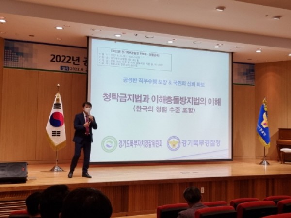 경기도북부자치경찰위원회는 경기북부경찰청과 합동으로 22일 오후 경기북부경찰청 다산홀에서 경찰공무원 및 위원회 사무국 직원 등 100여 명을 대상으로 청렴도 향상을 위한 교육을 개최했다고 밝혔다.이번 교육은 「공무원 행동강령」과 「청탁금지법」, 올해 5월 19일 시행된 「이해충돌방지법」 등과 관련해 자치경찰 공직자의 청렴 의식을 제고하고, 법 이해도 향상을 위해 마련됐다.이를 위해 국민권익위 청렴연수원 소속 전문 강사를 초청, …