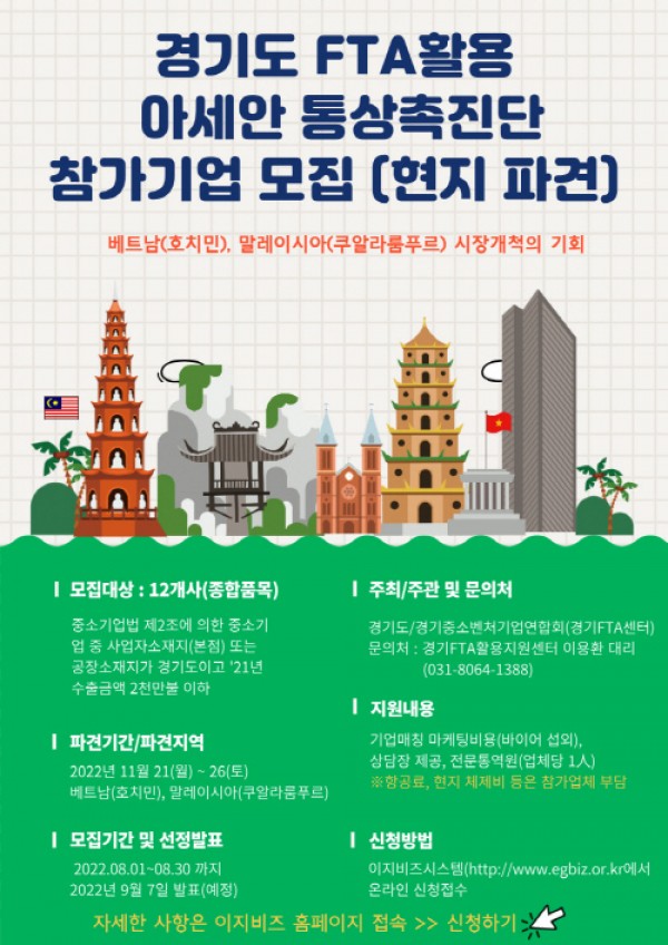 경기도와 경기FTA활용지원센터가 아세안 시장을 공략할 도내 중소기업을 오는 30일까지 모집한다. 아세안+통상촉진단+홍보+배너 ‘2022 경기도 아세안 통상촉진단’은 오는 11월 21일부터 26일까지 6일 동안 베트남(호치민)과 말레이시아(쿠알라룸푸르)에서 신규 구매자 발굴에 나선다.도내 중소기업 12개 업체로 구성되며, 참가업체는 수출실적, 해외규격인증 및 국내 특허 취득, 현지 시장성, 공공기관 인증서 등을…