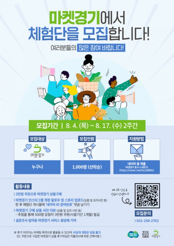 경기도농수산진흥원이 경기도 농식품 온라인몰인 ‘마켓경기’의 상품과 서비스에 대한 의견을 받기 위해 ‘마켓경기 체험단’ 1,000명을 8월 17일까지 모집한다. 마켓경기+체험단+포스터 온라인 쇼핑과 마켓경기(www.marketgg.co.kr)에 관심 있는 누구나 지원할 수 있다. 17일까지 네이버폼(https://naver.me/I5o26BNz)으로 ‘마켓경기 찜&소식 받기’ 참여 후 설문조사를 제출하…