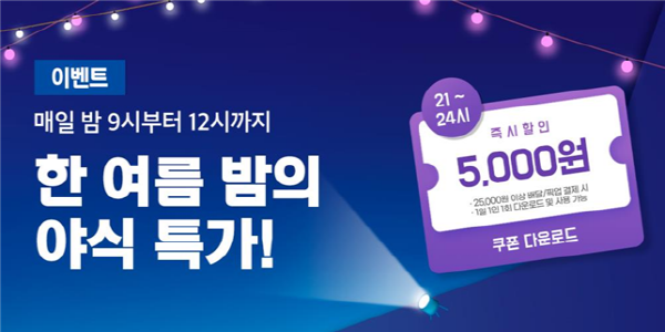 - 밤 9시~12시 주문 시 사용할 수 있는 5,000원 할인 쿠폰 제공