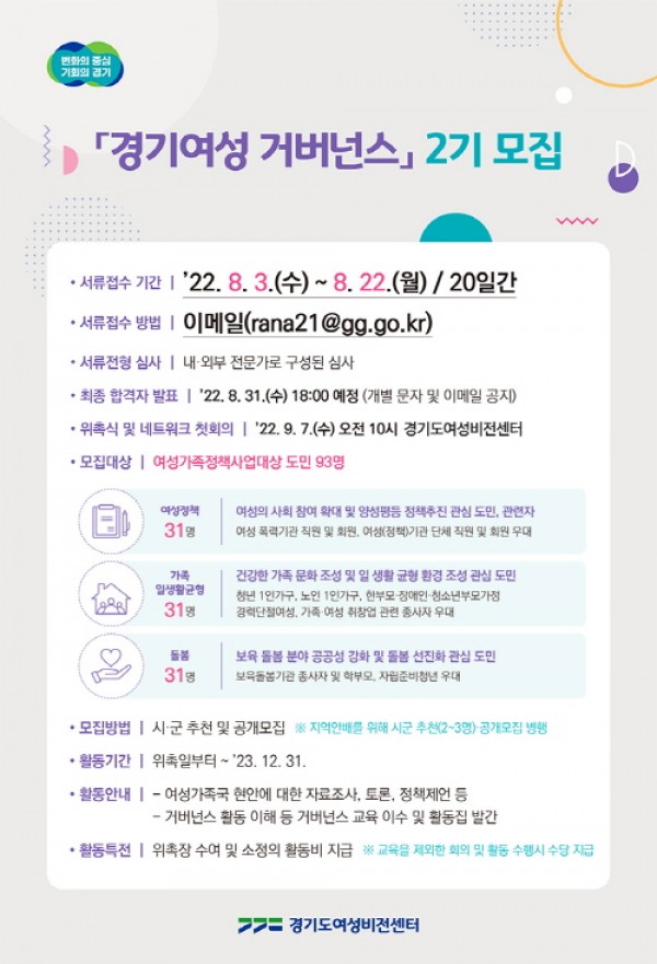 경기도가 도내 여성의 사회참여 확대 및 양성평등 정책·문화 확산을 위해 ‘제2기 경기여성 거버넌스’ 분야별 활동가 93명을 8월 22일까지 모집한다. 포스터 경기도여성비전센터가 운영하는 ‘경기여성 거버넌스’는 여성가족정책 분야를 여성정책, 가족 일생활균형, 돌봄 등 3개 분야로 나눠 정책의 실수혜자인 도민을 활동가로 모집해 함께 대안을 모색하는 정책 참여‧협력 체계다.모집 대상은 각 분야 관심 도민으로 ▲여…