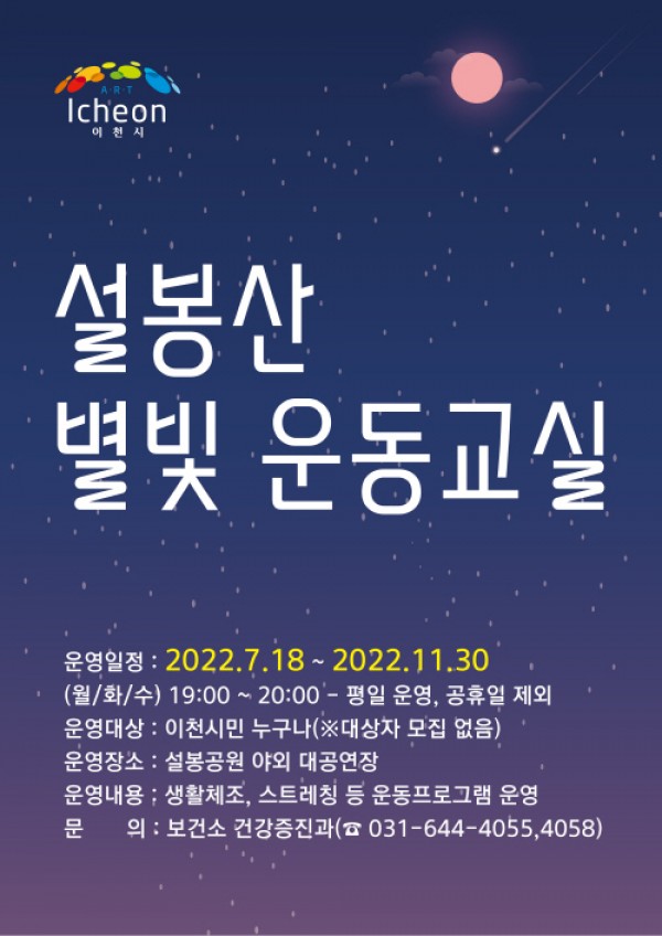 이천시(시장 김경희)는 건강한 운동환경 조성을 위해 7월 18일부터 11월 30일까지 설봉공원 야외대공연장에서 별빛운동교실을 진행한다. 설봉산 별빛운동교실설봉산 별빛운동교실은 시민 누구나 참여가 가능하며 평일 월, 화, 수요일(공휴일 제외) 오후 7시부터 8시까지 1시간동안 스트레칭, 생활체조, 라인댄스 등을 전문운동강사(강사: 김태희)와 함께 한다. 이천시는 코로나19 장기화로 우울과 무력…
