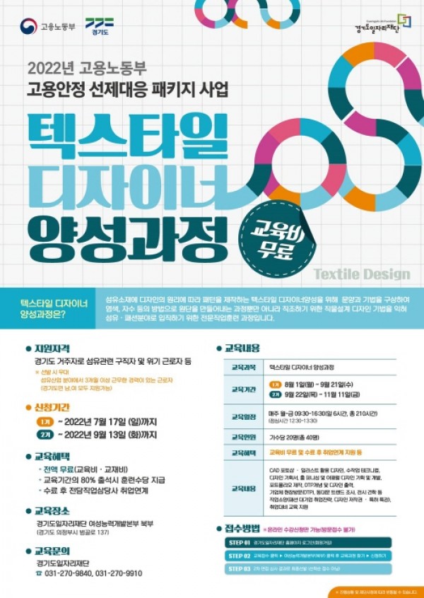 경기도일자리재단이 도내 섬유산업의 전문인력 양성을 위해 오는 17일까지 ‘텍스타일 디자이너 양성과정’ 1기 교육생을 모집한다. 경기도일자리재단(텍스타일)_웹포스터3(2) 이 사업은 고용노동부가 공모하고 지자체가 예산을 지원받는 ‘고용안정 선제 대응 패키지 지원사업’의 하나로 추진된다. 올해는 지자체 중 경기도와 3개 시(양주시․포천시․동두천시)가 선정됐으며, 경기도일자리재단이 과정 운영을 위한 수행기관으로 …