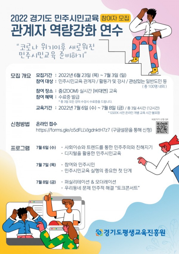 경기도평생교육진흥원은 7월 3일까지 민주시민교육 관계자와 활동가들의 역량 강화를 위한 온라인 연수 참가자를 모집한다. 참고용+포스터 7월 6일부터 8일까지 열리는 이번 연수는 현장 적용이 가능한 역량 강화를 목적으로 ▲민주주의와 민주시민교육의 이해(사회 이슈와 트렌드를 통한 민주주의와 친해지기, 참여와 민주주의) ▲민주시민교육 기획과 운영(디지털을 활용한 민주시민교육, 민주시민교육 실행의 중요한 첫 단계) ▲…