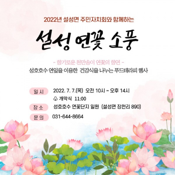 설성면 주민자치회(회장 김대훈)는 지역주민이 중심이 되어 스스로 고유 특성을 살린 문화사업을 기획하고 제안하는 “2022년도 문화자치활성화 공모사업”에 선정되어 연잎을 이용한 건강식을 나누는 『2022 설성 연꽃소풍 – 푸드테라피』 행사를 이번 달 7일에 개최한다. 설성 연꽃 소풍설성면 장천리 889번지 일원 성호호수에 위치한 5만㎡ 규모의 연꽃단지는 매년 7월에 홍련, 백련, 빅토리아 수련 등 갖가지 연꽃이…