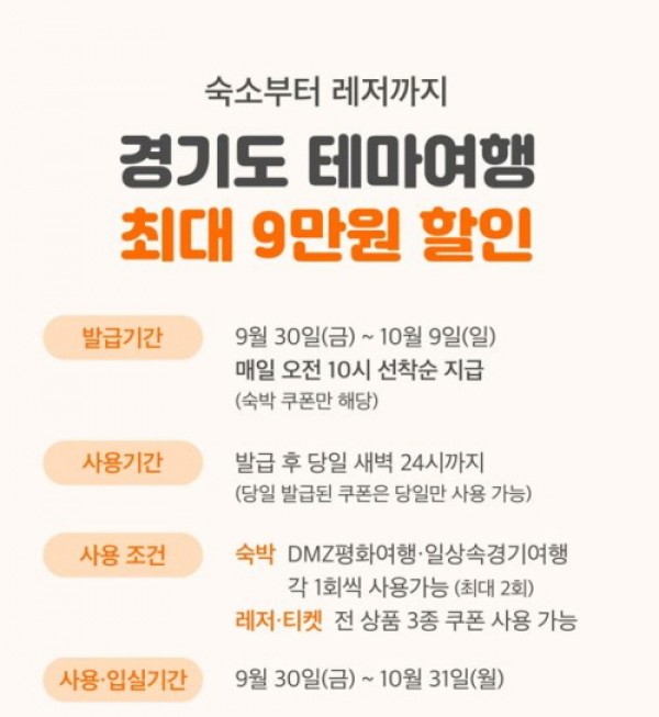 경기도와 경기관광공사가 김포·파주 등 DMZ(비무장지대) 일원과 수원 화성 행리단길 등을 품은 도내 16개 시·군의 숙박, 레저·체험 상품을 최대 9만 원 할인 판매하는 ‘경기도 여행상품 통합 기획전’을 9월 30일부터 10월 9일까지 진행한다. 상세이미지(경기도+여기어때) 이번 기획전은 가을철 나들이 시기를 맞아 지역 방문과 체류 관광 유도를 위해 추진됐으며, 국내 여행 플랫폼인 ‘여기어때’와 협력해 진행…