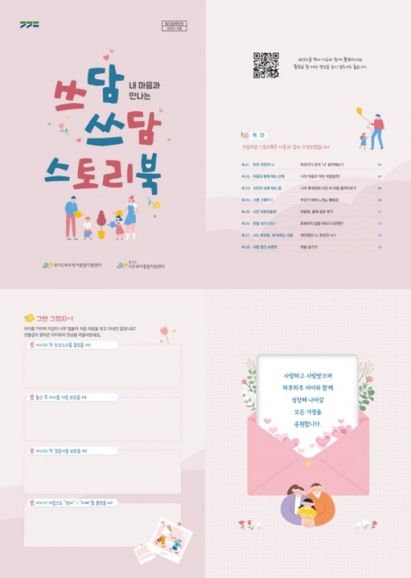 경기도와 경기도북부육아종합지원센터가 영유아 부모의 행복한 육아를 돕기 위한 ‘쓰담쓰담 스토리북’ 활동자료 2만2천 부를 제작해 배포한다. 쓰담쓰담+스토리북+사진 이번 발간물은 자녀 양육 과정의 부담을 내려놓고 행복감을 상기시킬 수 있는 계기를 마련하고자 제작됐다. 주요 내용은 ▲부모 이전의 나 ▲마음과 함께하는 산책 ▲사진이 내게 하는 말 ▲그땐 그랬지 ▲시간 자유이용권 ▲만일 내가 다시 등으로 구성됐다. …