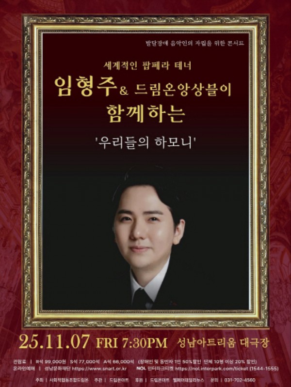 세계적인 팝페라 테너 임형주(로마시립예술대학 성악과 석좌교수)는 장애인과 고령자를 비롯한 사회적 취약계층의 일자리 창출 및 전문적 문화예술 교육 실시하여 직업 예술인으로 성장할 수 있도록 기회를 제공하는 사회적협동조합 드림온과 공동으로 "임형주 & 드림온앙상블이 함께하는 우리들의 하모니" 타이틀로 2025년 11월 7일(금) 19:30 성남아트리움 대극장에서 콘서트를 개최한다.팝페라 테너 임형주, 드림온앙상블과 함께하는…