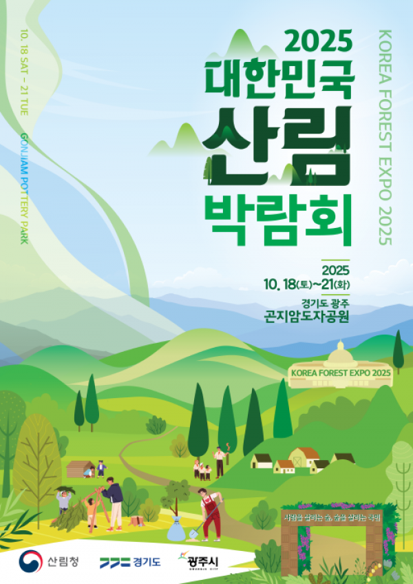 경기도, 산림청, 광주시가 오는 18일부터 21일까지 광주시 곤지암도자공원에서 ‘2025 대한민국 산림박람회’를 개최한다. 메인포스터(2025+대한민국+산림박람회)이번 행사는 전국 최대 규모의 산림박람회로, 수도권에서는 2009년 안산시 이후 16년 만이다.18일 오후 ‘산의 날 기념식(개막식)’을 시작으로 주제전시관, 기업관·홍보관, 임산물 판매관, 체험·전시, 세미나, 공연 및 연계행사 등 다양한 프로그램이 진행될…
